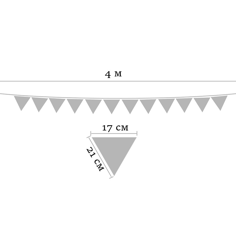 Гирлянда состоит из 12 флажков. Расстояние между флажками - 6 см, общая длина составляет 4 м.